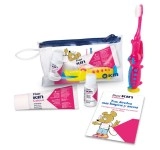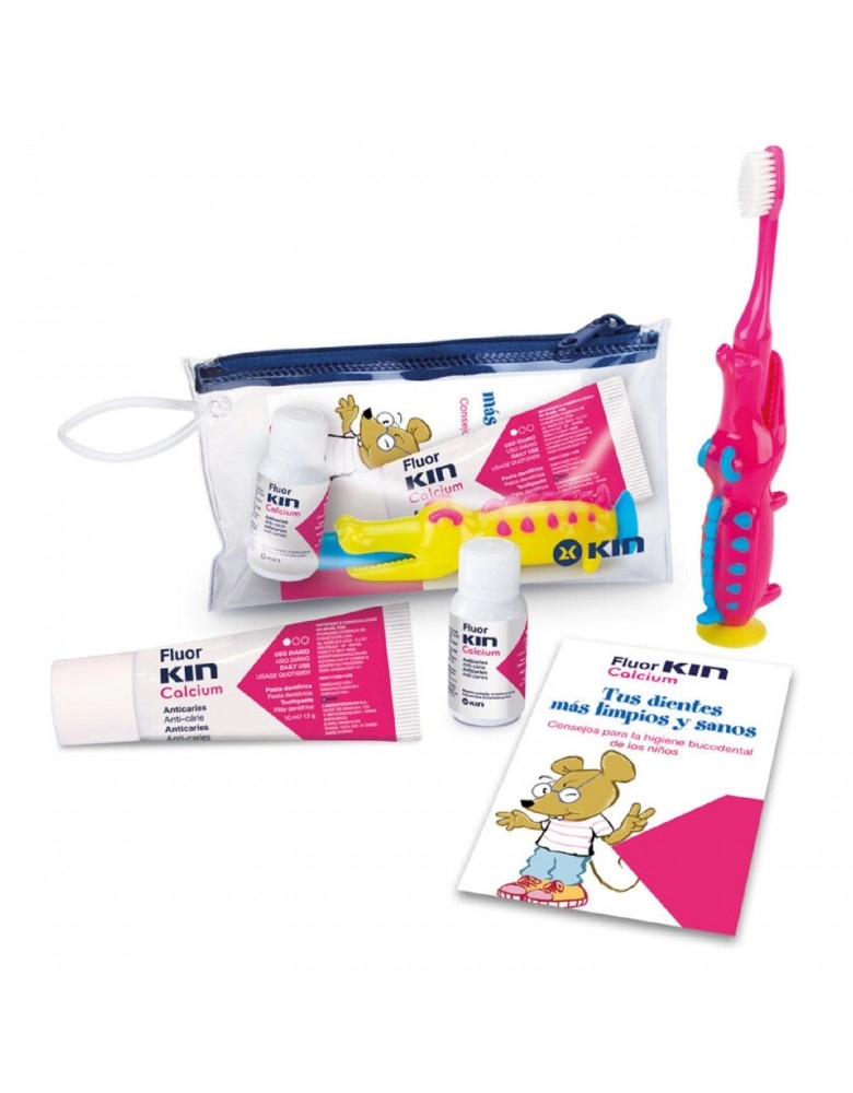 Toothbrush with an attractive crocodile-shaped design in different colors makes brushing more fun. It includes a practical cosmetic bag, the strawberry-flavored FluorKIN Calcium toothpaste, and rinse that protects against cavities and strengthens enamel.