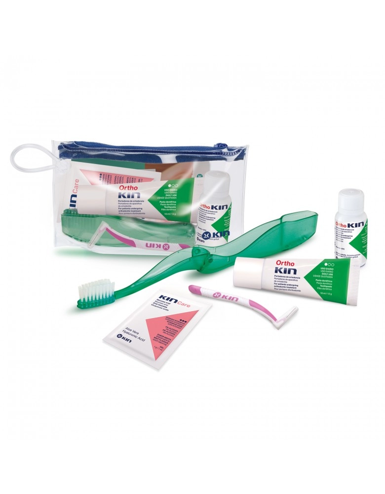 Kit consisting of toiletry bag, KIN travel toothbrush, OrthoKIN strawberry/mint toothpaste 10 ml, OrthoKIN strawberry/mint mouthwash 12 ml, Kin Care gel 1g, and KIN Ultramicro interproximal brush.