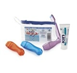 Cepillo dental diseñado con un mango anatómico antideslizante plegable para poder llevarlo siempre encima. Incorpora dentro de un práctico neceser un tubo de dentifrico KIN de 25 ml.