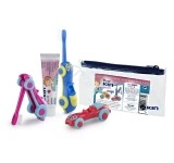 Cepillo dental con un atractivo diseño en forma de coche en diferentes colores, hace más divertido el cepillado. Incluye, dentro de un práctico neceser, el dentífrico FluorKIN Infantil sabor fresa que protege contra la caries y refuerza el esmalte.