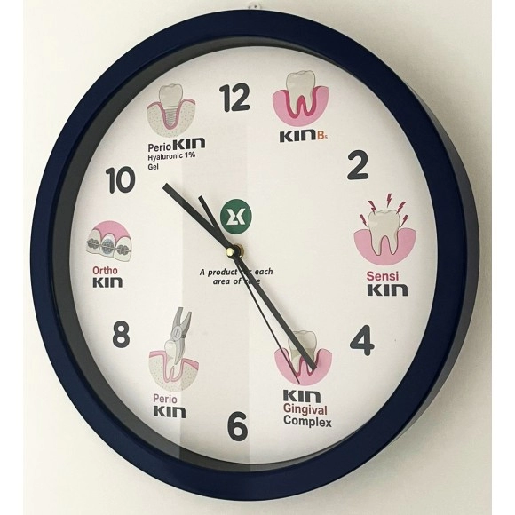 Este reloj ha sido diseñado como una herramienta de visibilidad de marca pensada para el dentista. Su presencia en la consulta funciona como un recordatorio elegante y constante de que hay un producto KIN que atiende a cada necesidad que su paciente pueda presentar, integrándose de forma natural en el entorno clínico.