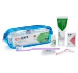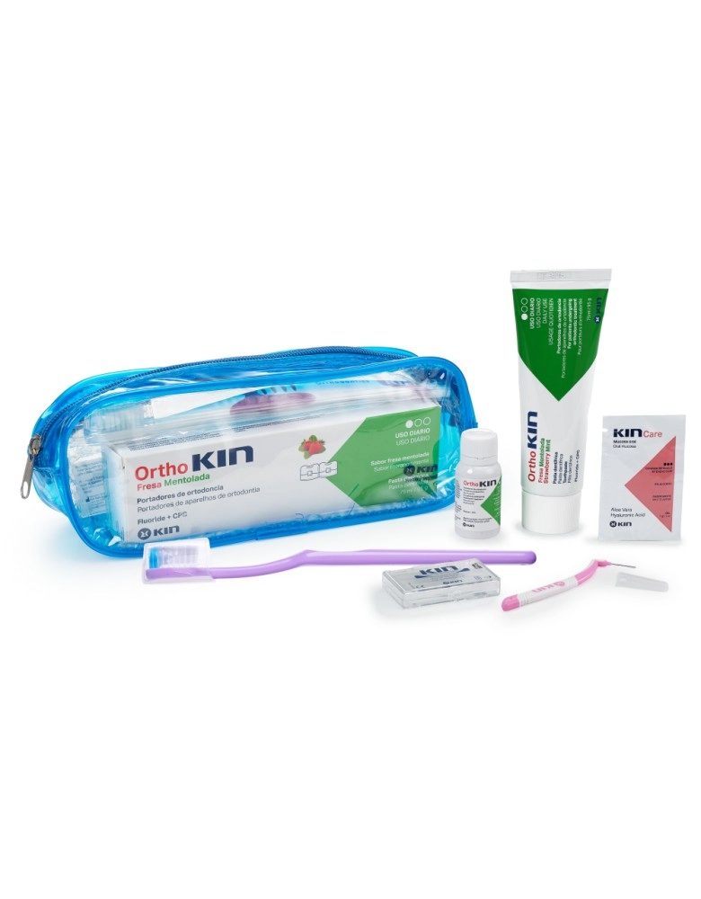 Kit formado por neceser, cepillo de ortodoncia KIN, pasta dentífrica OrthoKIN Fresa mentolada de 75 ml y enjuague bucal de 12 ml, Kin Care gel 1g y cepillo interproximal KIN Ultramicro y cera KIN.