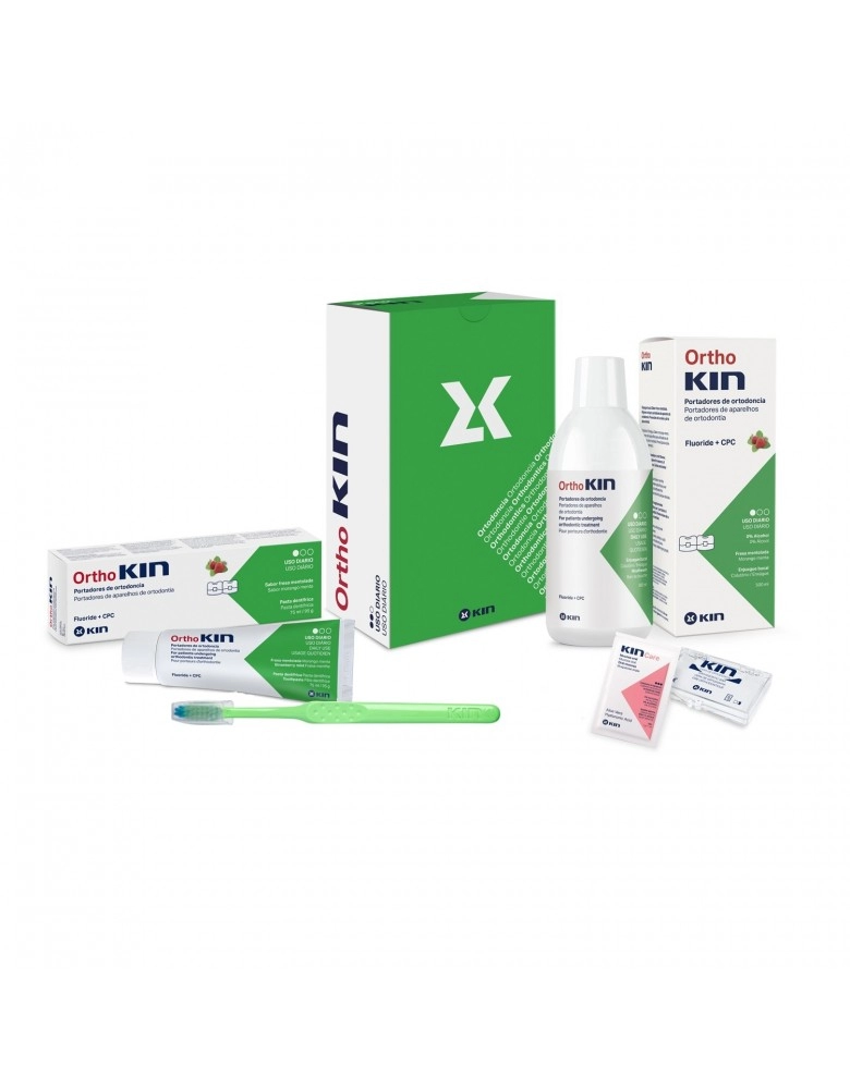 Pack formado por la pasta dentífrica OrthoKIN Fresa mentolada de 75 ml , enjuague bucal OrthoKIN Fresa mentolada de 500 ml, una monodosis de Kin Care gel de 1g, cera de ortodoncia KIN , Cepillo interdental KIN ultramicro y un cepillo KIN ortodoncia. De venta exclusiva en clínica con el fin de ofrecer a los pacientes el Pack de higiene oral completa para el cuidado de dientes, brackets y encías.